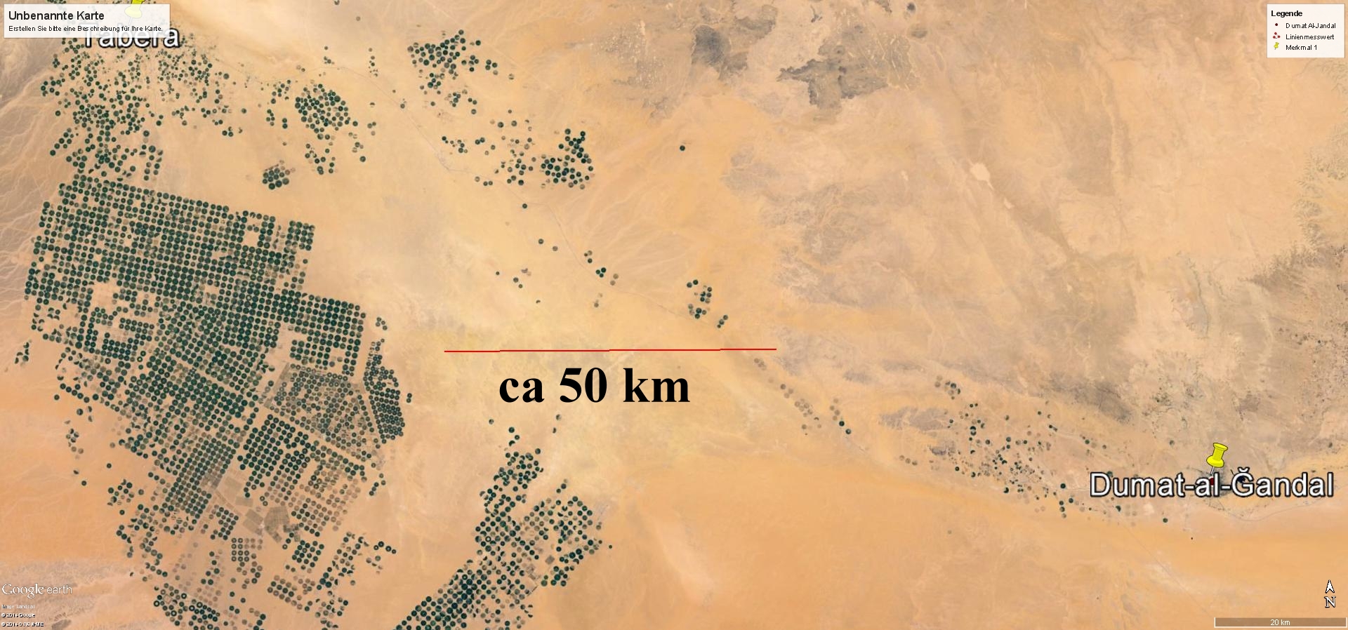 Im Wadi Sirhan zwischen Jauf-Dumat und Tabera/Tabarjal werden kreisrunde Areale großflächig bewässert; die größeren Kreise haben einen Durchmesser von 900 Metern; die rote Linie im Satellitenbild mißt 50 km.
